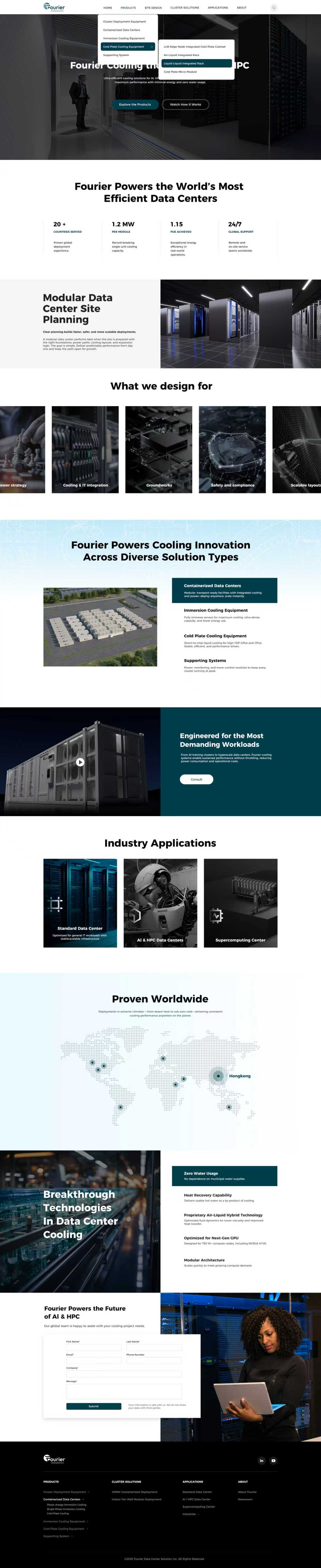 Fourier provides end-to-end liquid cooling solutions for high-density data centers. Centered on direct-to-chip and immersion liquid cooling solutions, we deliver complete, turnkey solutions. Our focus is simple: enable AI, cloud, and edge workloads to run at higher density and lower PUE—reliably, safely, and at scale.